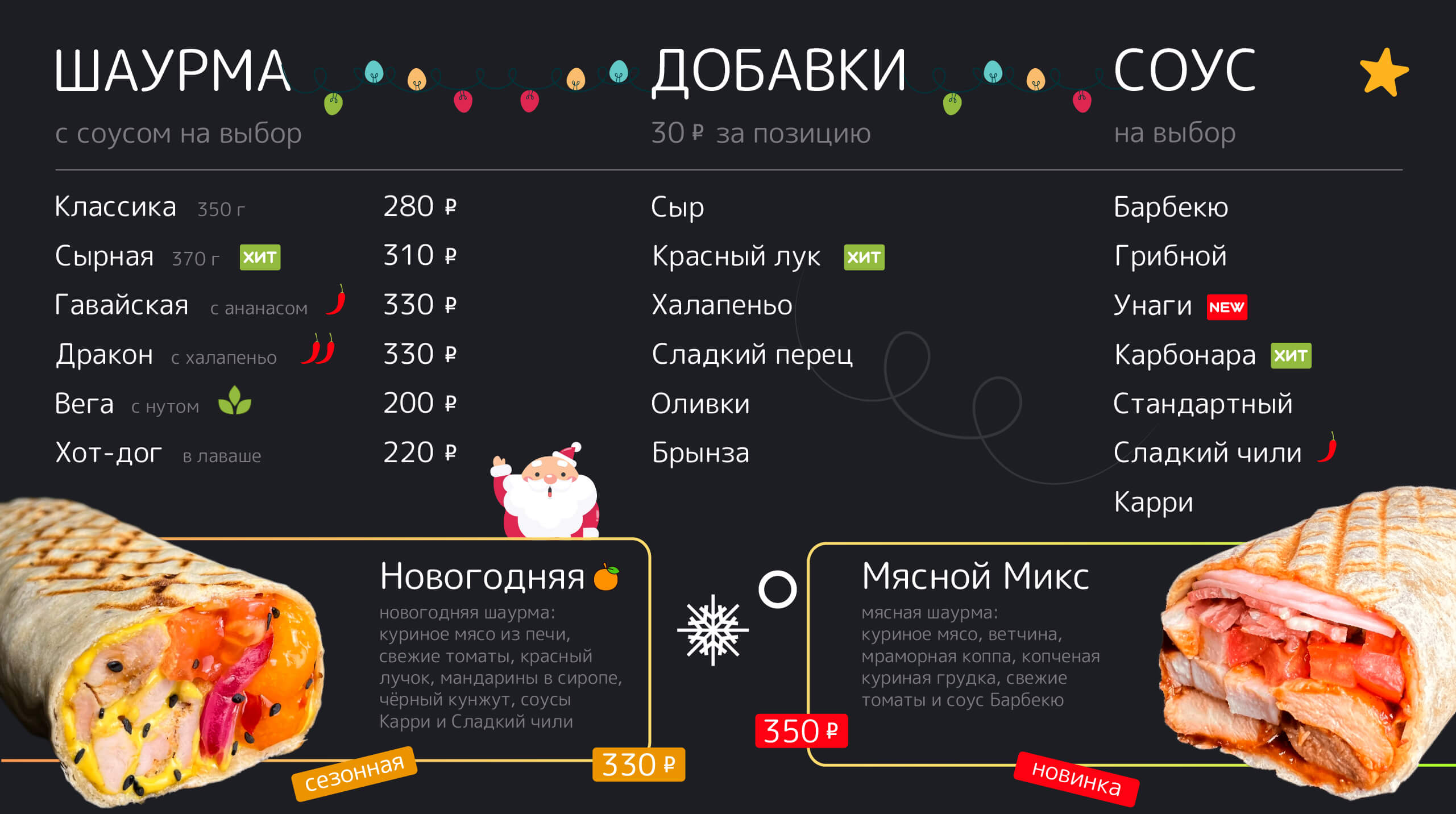 Шаурма на бездрожжевом лаваше с семенами чиа со жгучей начинкой: мно-о-ого мяса, ломтики огурчика, свежие томаты, пикантный халапеньо и одноименный острый соус на основе пюре перца чили!